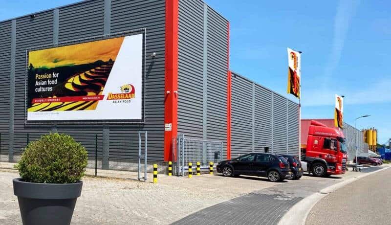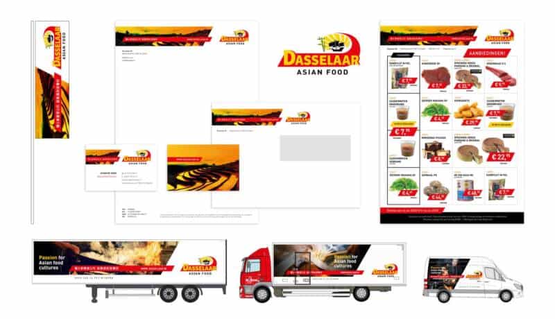 De kenmerkende rood/gele uitstraling en foto’s zijn doorgevoerd in alle uitingen zoals website, drukwerk en signing aan het pand en vrachtwagens. Dasselaar Asian Food is een merk geworden!