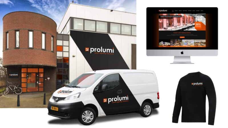 De herkenbare huisstijl is niet enkel doorgevoerd is het briefpapier, maar dit is onder meer doorgezet in kleding, beplakking van het wagenpark en signing van het pand. Alles bij elkaar maakt dat Prolumi een herkenbaar merk is geworden, waar ook wij trots op zijn!